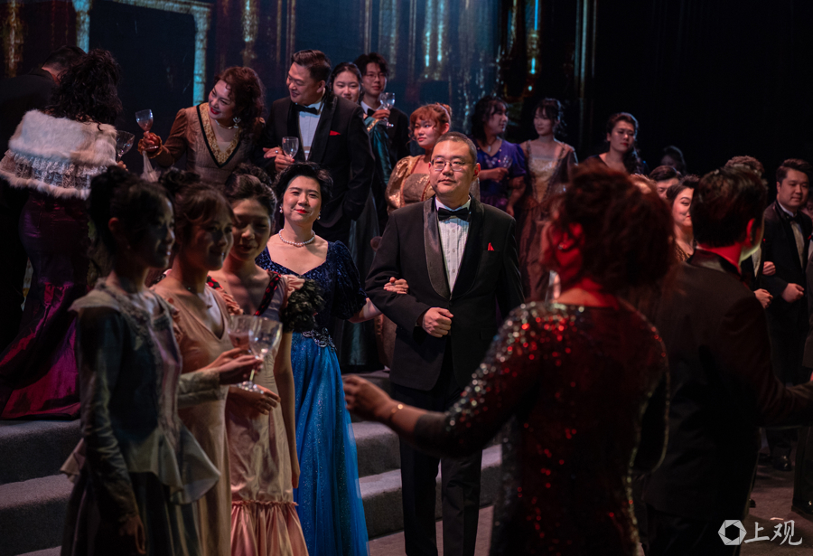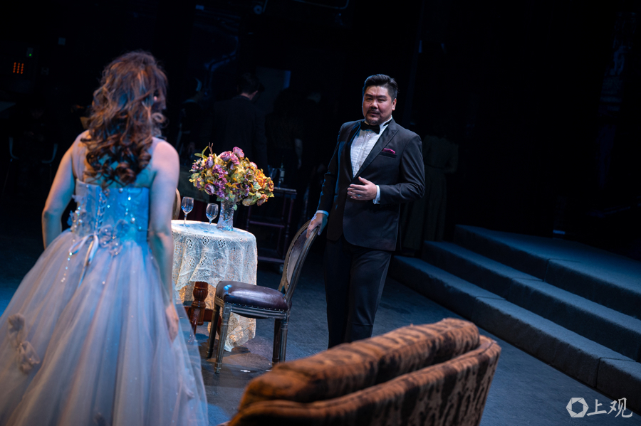当晚演出中,上海歌剧院歌剧团团长、男高音歌唱家于浩磊饰演阿尔弗莱多,女高音歌唱家杨丽莹出演维奥莱塔。杨丽莹以细腻而富有层次的演唱,塑造出维奥莱塔在爱情与现实之间不断挣扎的内心世界;于浩磊则以稳健而富戏剧张力的声音,呈现了阿尔弗莱多情感由热烈走向成熟的转变。两位主演在多首经典唱段中的配合,使人物情感脉络清晰而饱满,获得现场观众的热烈反响。